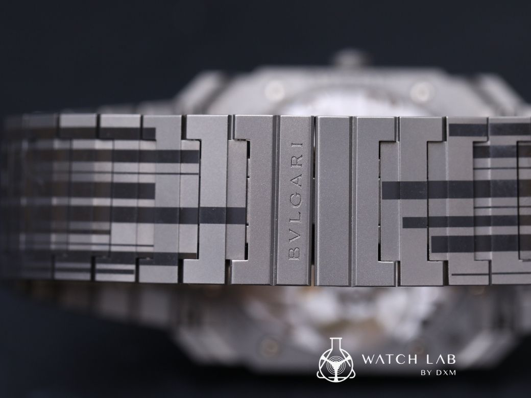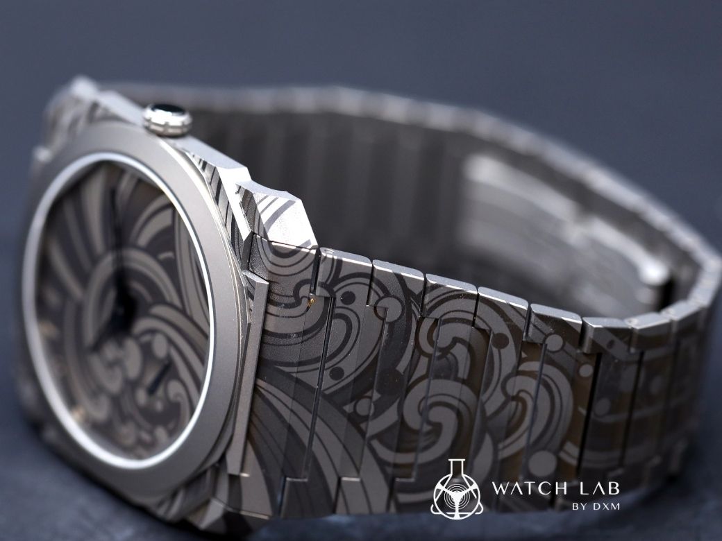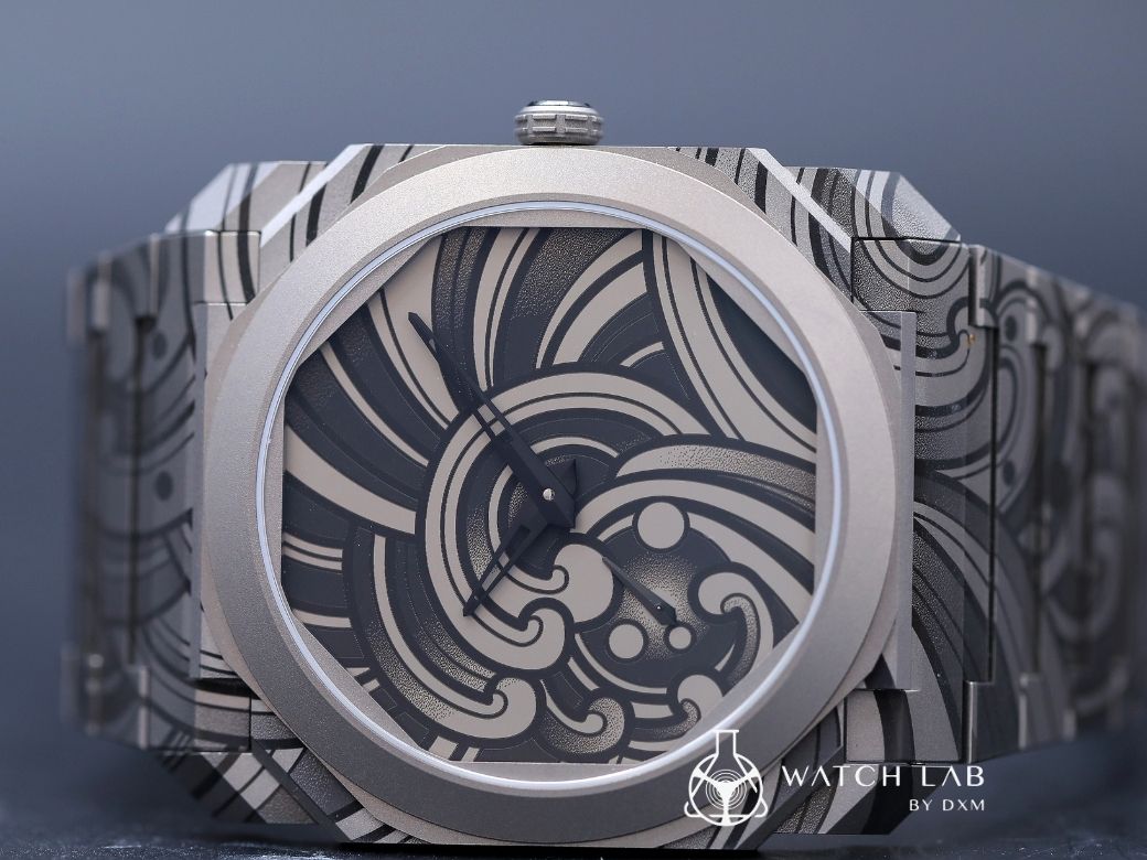 材質: 錶殼與錶鏈為鈦金屬 (titanium),表面為噴砂/霧面鈦 (sand-blasted titanium),整體設計保持 Octo Finissimo 系列的一致語彙(超薄 /幾何感 /結構化設計),但以紋身藝術圖案覆蓋錶殼與鍊帶。