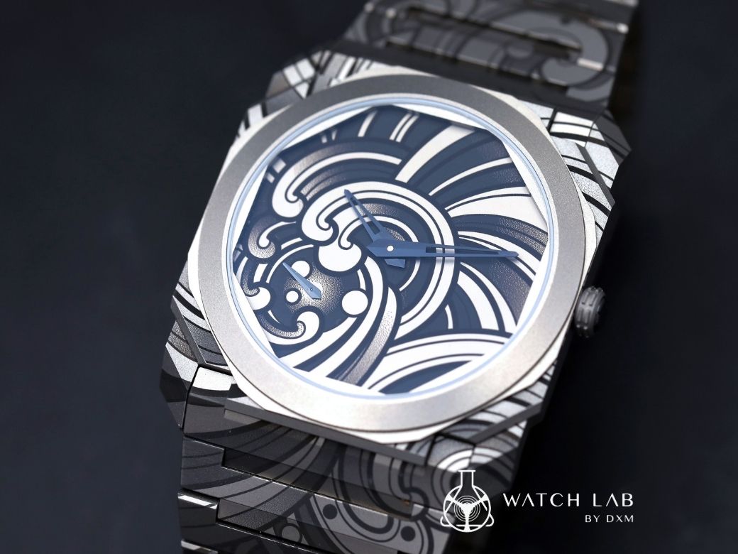 面盤: 「Tattoo Acqua」這款以“水 / 波浪 /流動感”為靈感,整隻錶(除了錶圈 bezel)覆蓋有雷射雕刻(laser-engraved)紋身圖案,呈現流動波浪、水紋、曲線等視覺語彙