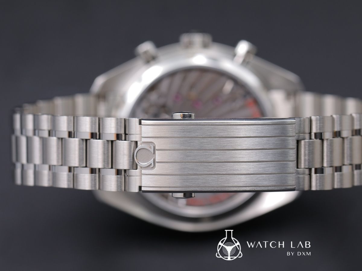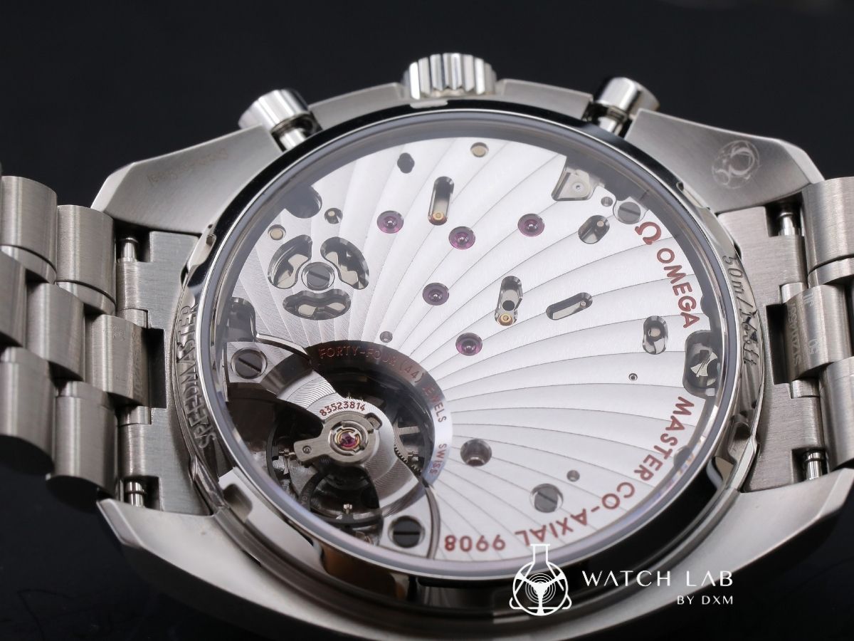 功能: 導柱輪/同軸擒縱系統手上鏈計時機芯/9908機芯/大師天文台認證/抗磁力/矽游絲/雙發條盒相互連接/時分及計時秒針/小秒針/12小時計時盤及60分鐘計時盤