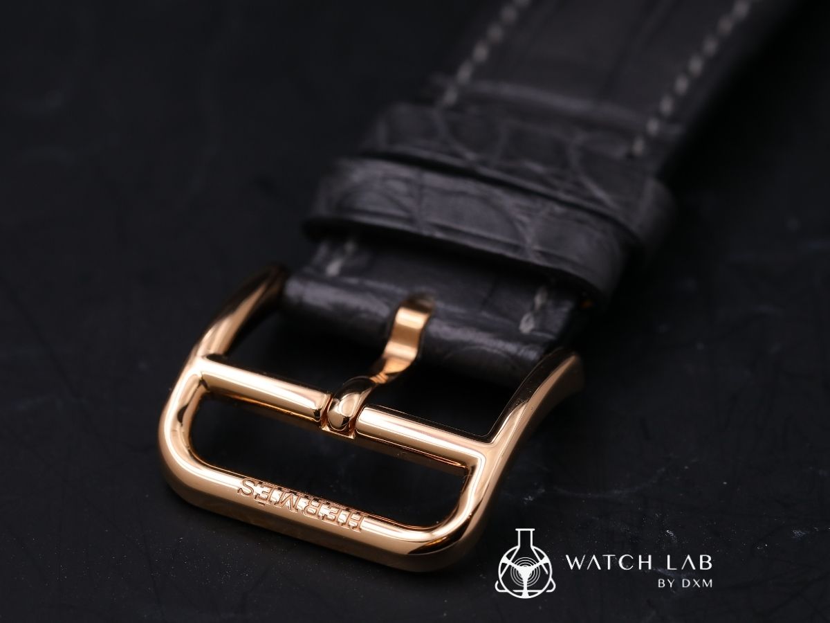 功能: Hermès錶廠自製H1953超薄自動上鍊機械機芯,約48小時動力儲存/時、分顯示功能,月相顯示設於6點鐘位置