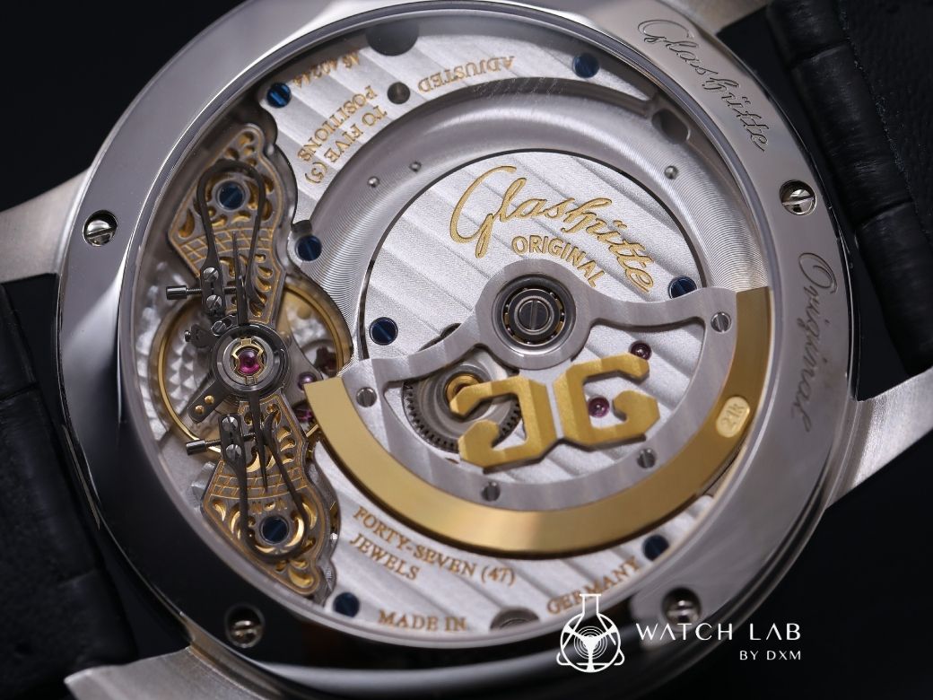 功能: 柱狀紋飾的格拉蘇蒂3/4夾板/手工鐫刻擺輪夾板/雙鵝頸微調/鏤空21K金帶品牌標誌性的雙G標識自動盤 倒角/拋光鋼質零件/藍鋼螺絲/月相大日期窗/小秒針
